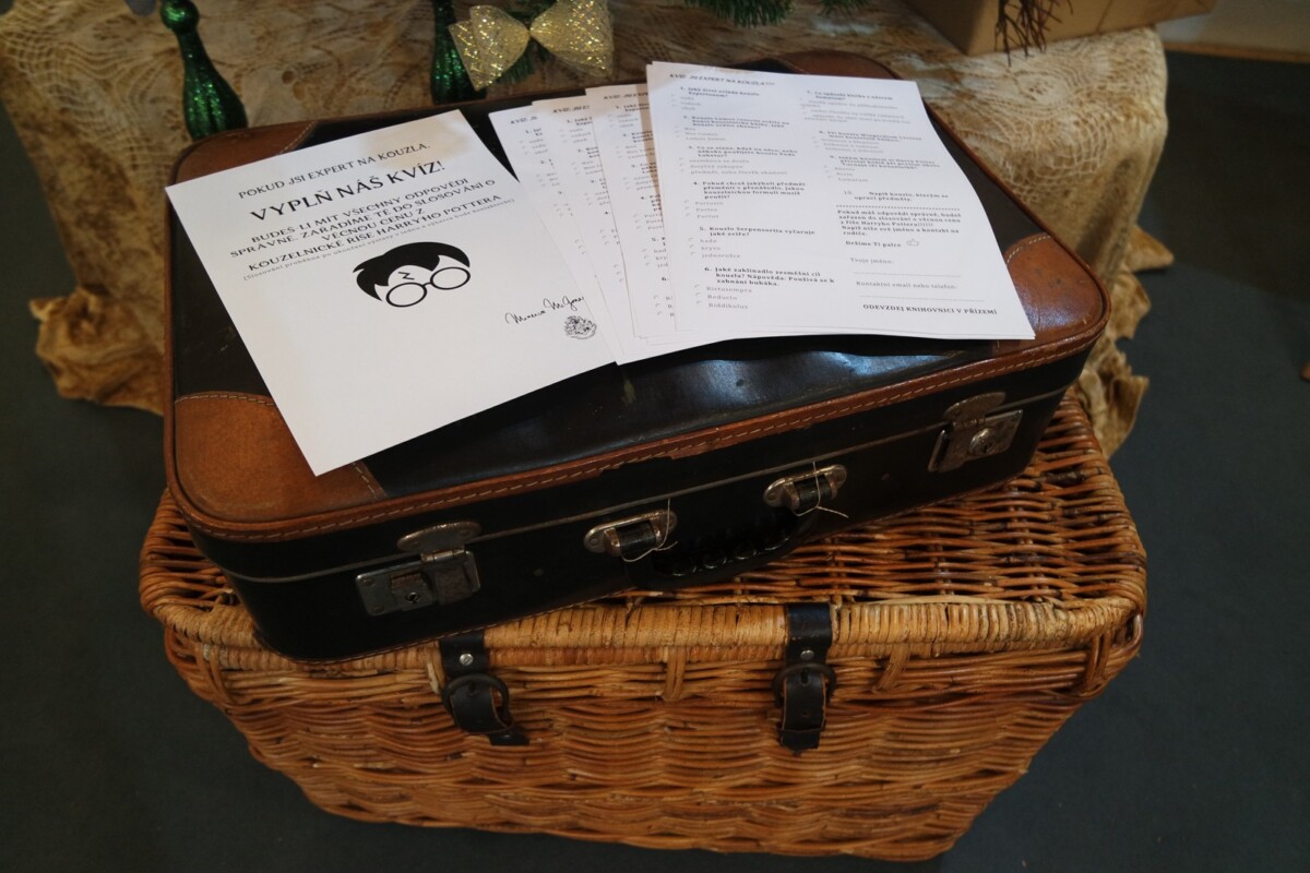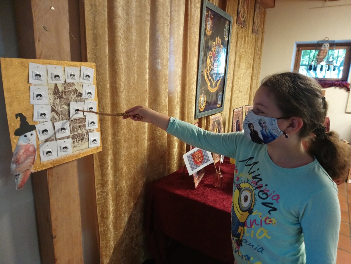 A proč právě tuto literární postavu? Tento rok jsme totiž oslavili již 20. výročí od vydání prvního dílu celé série v českém překladu. Zprvu jsme tématu chtěli věnovat pouze knihovnickou Noc s Andersenem, ale jelikož se její konání vzhledem k nástupu covidové epidemie zrušilo, přemýšleli jsme, jak se k tématu vrátit později. Vzhledem k nemožnosti konání kulturních akcí v různé míře po celý rok se však alespoň něco uskutečnit podařilo. Noc s Andersenem jsme uspořádali distančně. Všichni účastníci, již od jara přihlášení, obdrželi jednoho podzimního dne poštou obálku s úkoly, které mohli plnit doma a v průběhu několika dní. Po jejich splnění je měli přinést průběžně do knihovny a zúčastnit se tomboly o ceny. To, že děti skutečně chodit začaly, nám udělalo v té pochmurné době obrovskou radost! Knihovnu jsme pro tuto příležitost vyzdobili v bradavickém designu a děti si za pomoci kouzelnické hůlky „vyčarovaly“ své šťastné číslo do loterie. Vyrobili jsme mnoho kouzelnických artefaktů a rekvizit, které jsme se rozhodli v prosinci využít k výstavě v naší galerii. Součástí výstavy „Vánoce v Bradavicích“ byl i malý kvíz ve znalostech kouzelnického světa. Bohužel, štěstí nám koncem roku nepřálo a knihovny byly opět na další měsíce z rozhodnutí vlády uzavřeny. Příležitost výstavu navštívit byla tedy bohužel jen pár dní. My jsme však i přesto nepodlehli skepsi a začali zpracovávat téma pro následující rok v očekávání, že bude příznivější.