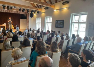 V úterý 13. září 2022 jsme přivítali na besedě novináře Tomáše Etzlera. Prodej jeho knihy Novinářem v Číně-Co jsem to proboha udělal dosahuje výrazných čísel a nebyl tedy překvapením do posledního místa zaplněný Velký sál. Přes dvě hodiny poutavého vyprávění a odpovědí na dotazy z publika utekly jako voda. Po skončení následovala autogramiáda a příslib, že po vydání právě rozepsaného pokračování se u nás v Chabrech opět sejdeme. Umožníme tak setkání s populárním novinářem i těm, na které se pro velký zájem k naší lítosti nedostalo.