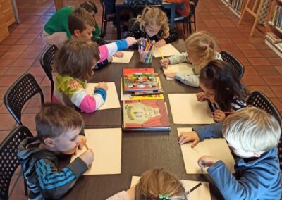 V podzimních měsících říjnu a listopadu jsme v knihovně uvítali děti z mateřské školy Beranov. Postupně se u nás vystřídaly všechny třídy. Třída Koťátek si stihla prohlédnout výstavu mozaik architektky Blanky Červinkové a vyzkoušela si, jak keramický obrázek z maličkatých úlomků vzniká. Další třídy zase obdivovaly listopadovou výstavu šitých panenek a skřítků Helen Andrlové. Všechny děti jsme také seznámili s funkcí knihovny a popovídali si o knížkách. Na rozloučenou nám namalovaly krásné podzimní obrázky. Na viděnou v knihovně!