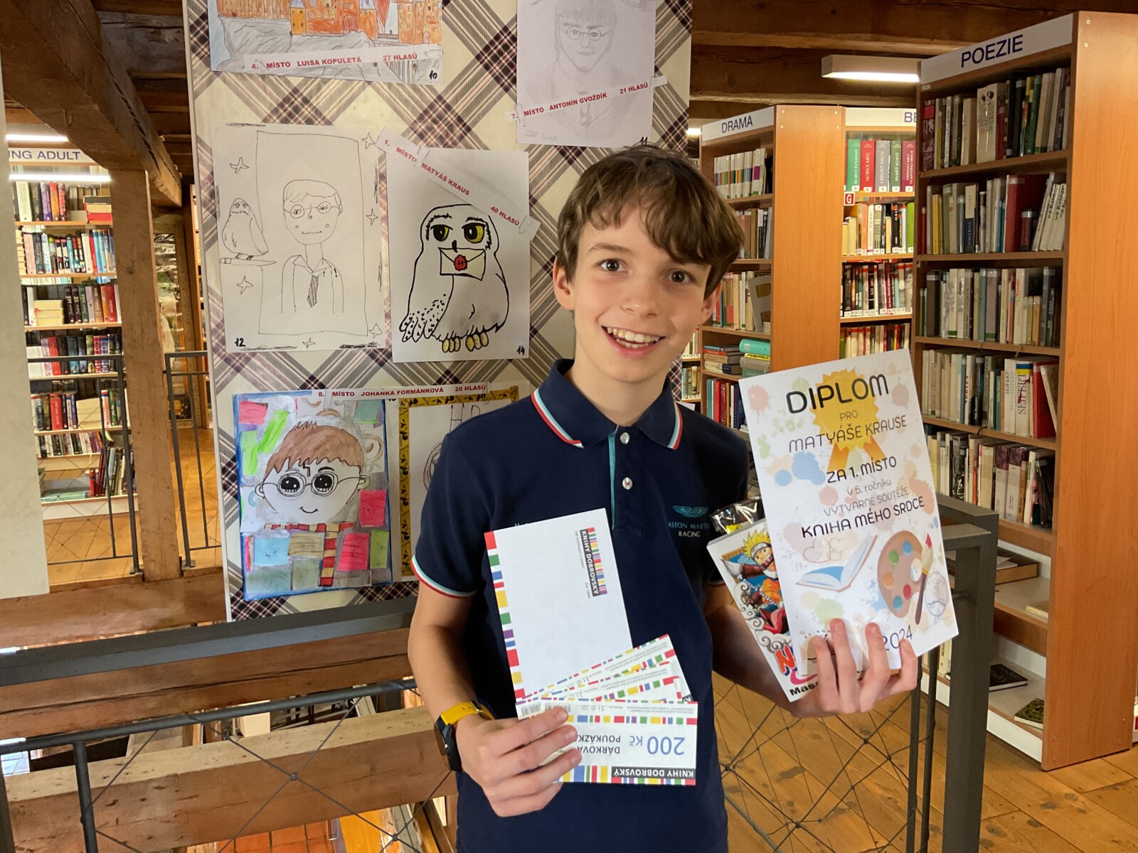 Počátek roku nám prostředí knihovny vyzdobily obrázky k soutěži Kniha mého srdce. Své výtvory přihlásilo šestnáct dětí a do hlasování se zapojili návštěvníci od nejmenších po dospělé, skupinové návštěvy školní družiny nebo školkové třídy místní i z okolí. Celkem bylo odevzdáno 284 hlasů, které rozhodly o výsledcích. S počtem 40 hlasů zvítězil Matyáš Kraus s obrázkem ke knize Harry Potter. Na druhém místě se s 36 hlasy umístila Sophia Hlaváčová, na třetím s počtem 28 hlasů Veronika Dušková. Na dalších předních místech skončila Luisa Kopuletá, Ema Růžková, Eliška Marková a Antonín Gvoždík. První tři obdrželi kromě jiného poukázky na nákup v knihkupectví a ostatní umístění drobnou odměnu od nakladatelství CREW a malou sladkost. Gratulujeme a děkujeme všem za účast!