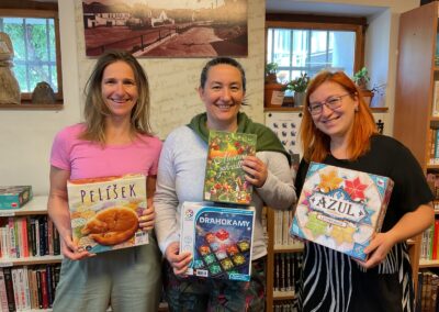 Děkuji výše jmenovaným za nadšení a ochotu seznamovat po celý den s pravidly a také za darované společenské hry do fondu knihovny (Rhino Hero, Ulož svoje knihy a Via Magica). Také nás těší zájem o deskovky z řad chaberské veřejnosti. Na další den plný deskovek se předběžně můžete těšit v listopadu.