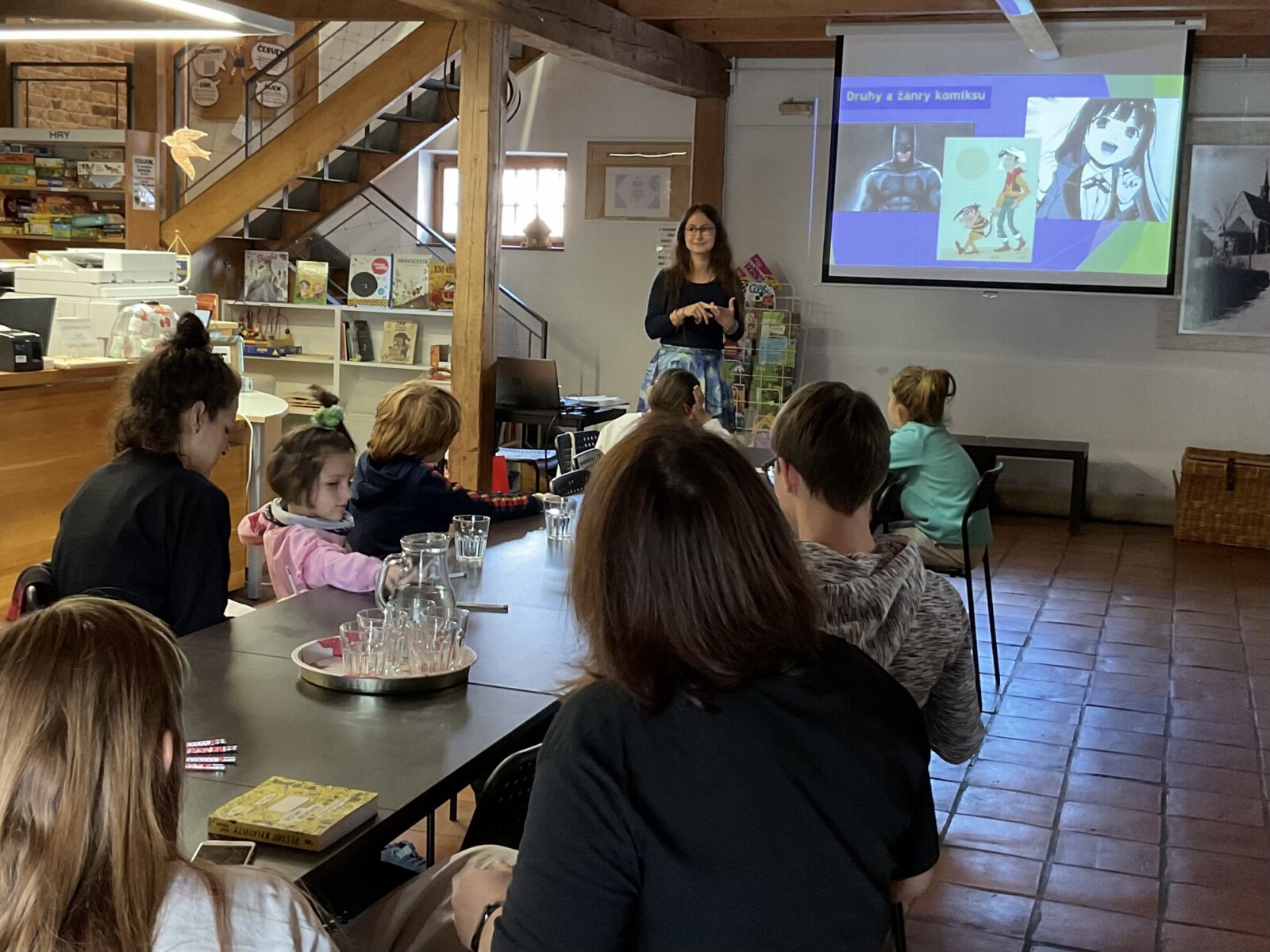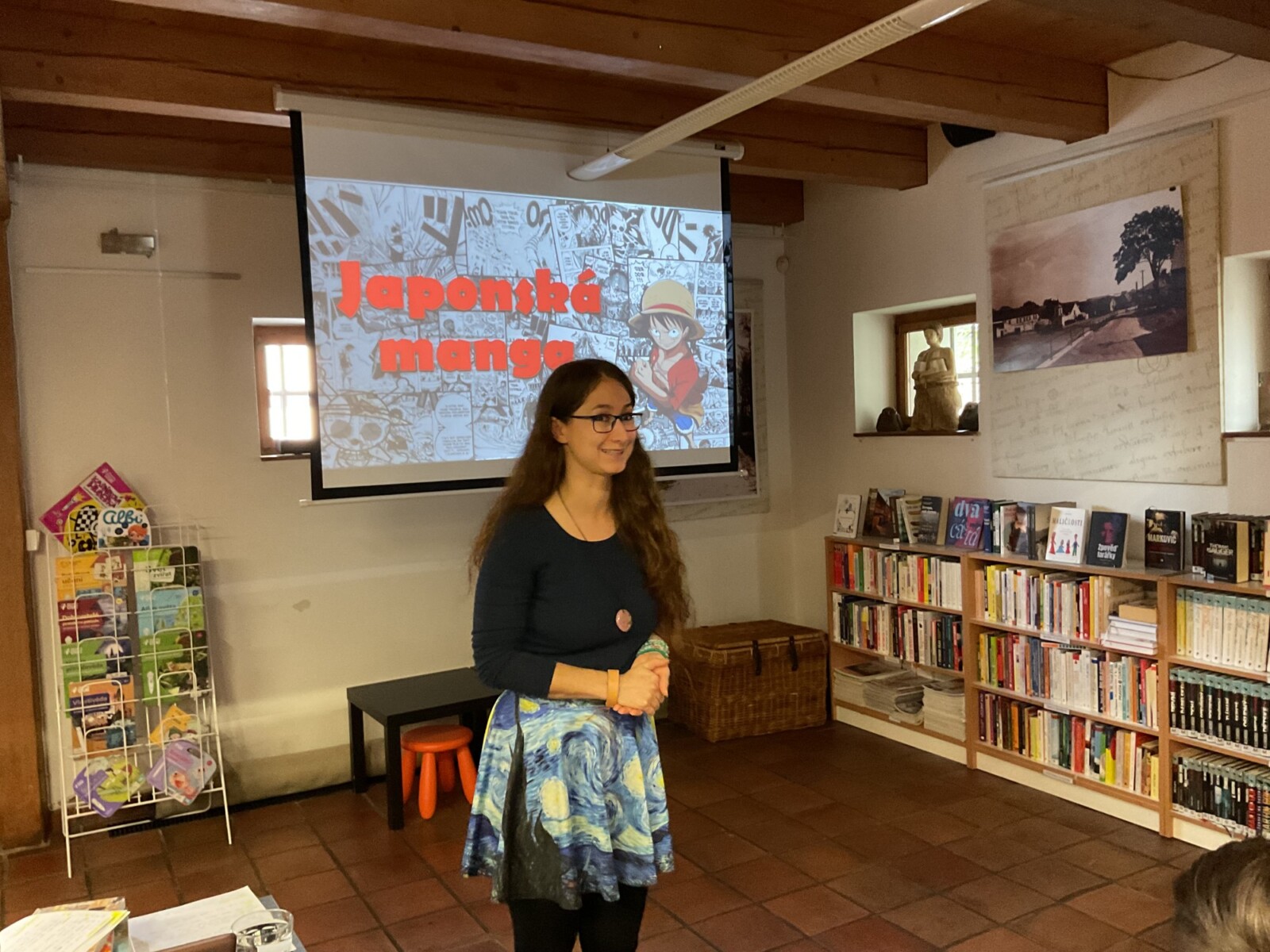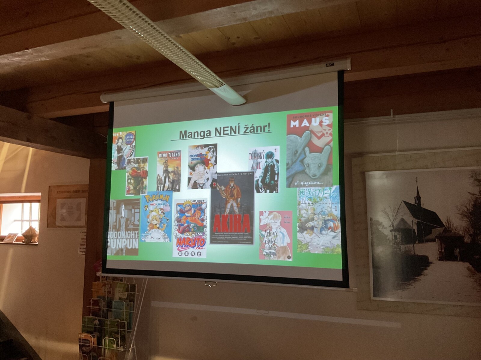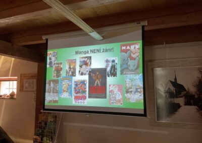 Druhá dvouhodinovka patřila starším zájemcům o japonskou MANGU. Poslechli jsme si povídání o tom, co inspirovalo její vznik a kdy to bylo, kdo byli první autoři, jak se má MANGA správně číst i na jaké novinky z CREW nakladatelství se můžeme v brzké době těšit. A jelikož naše knihovna disponuje mnoha zmiňovanými tituly, hned po skončení jsme do knihovny zaregistrovali několik nových, workshopem inspirovaných čtenářů a zájemců o jejich vypůjčení.