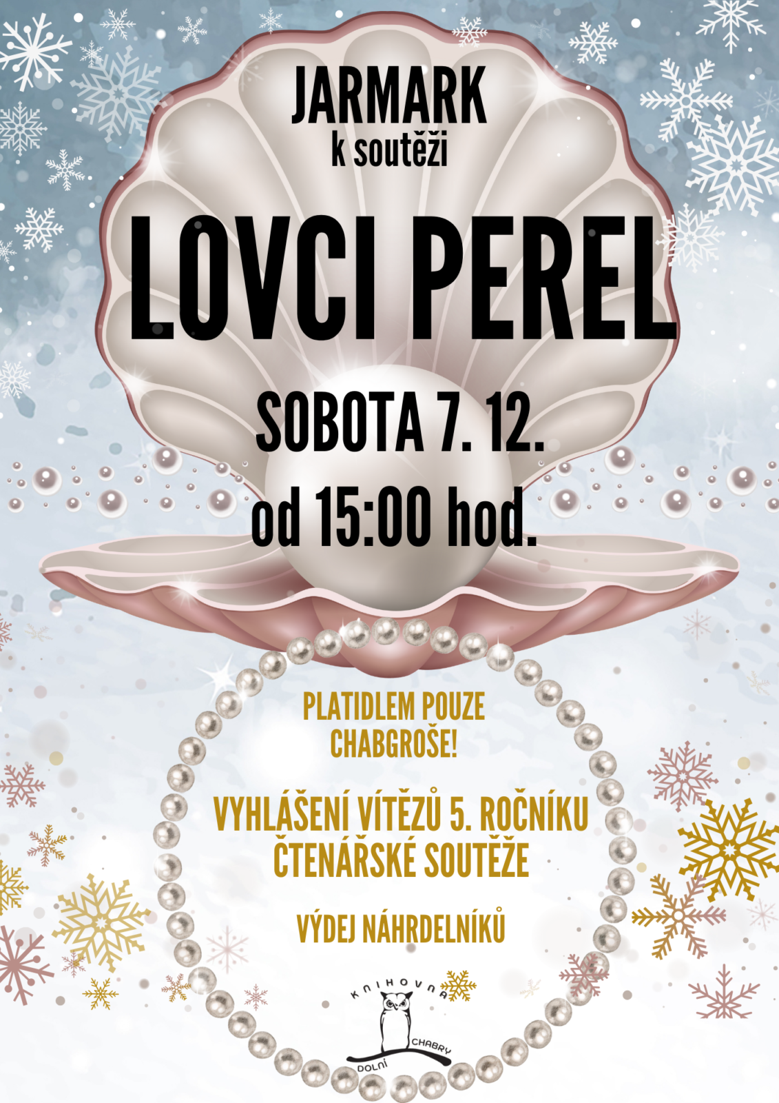 Sběr perliček letos končí v sobotu 23. 11. Poté budeme počítat a vyhodnocovat nejlepší z účastníků, kterých je tento rok rekordní počet. Otevřete trezory, prohledejte skrýše, nakoukněte pod matraci nebo do batohu, dejte dohromady všechny Chabgroše, které jste po celý rok poctivě získávali, a přijďte je utratit do knihovny. Předvánoční jarmark a vyhlášení vítězů se bude konat v sobotu 7. 12. od 15:00 hodin.