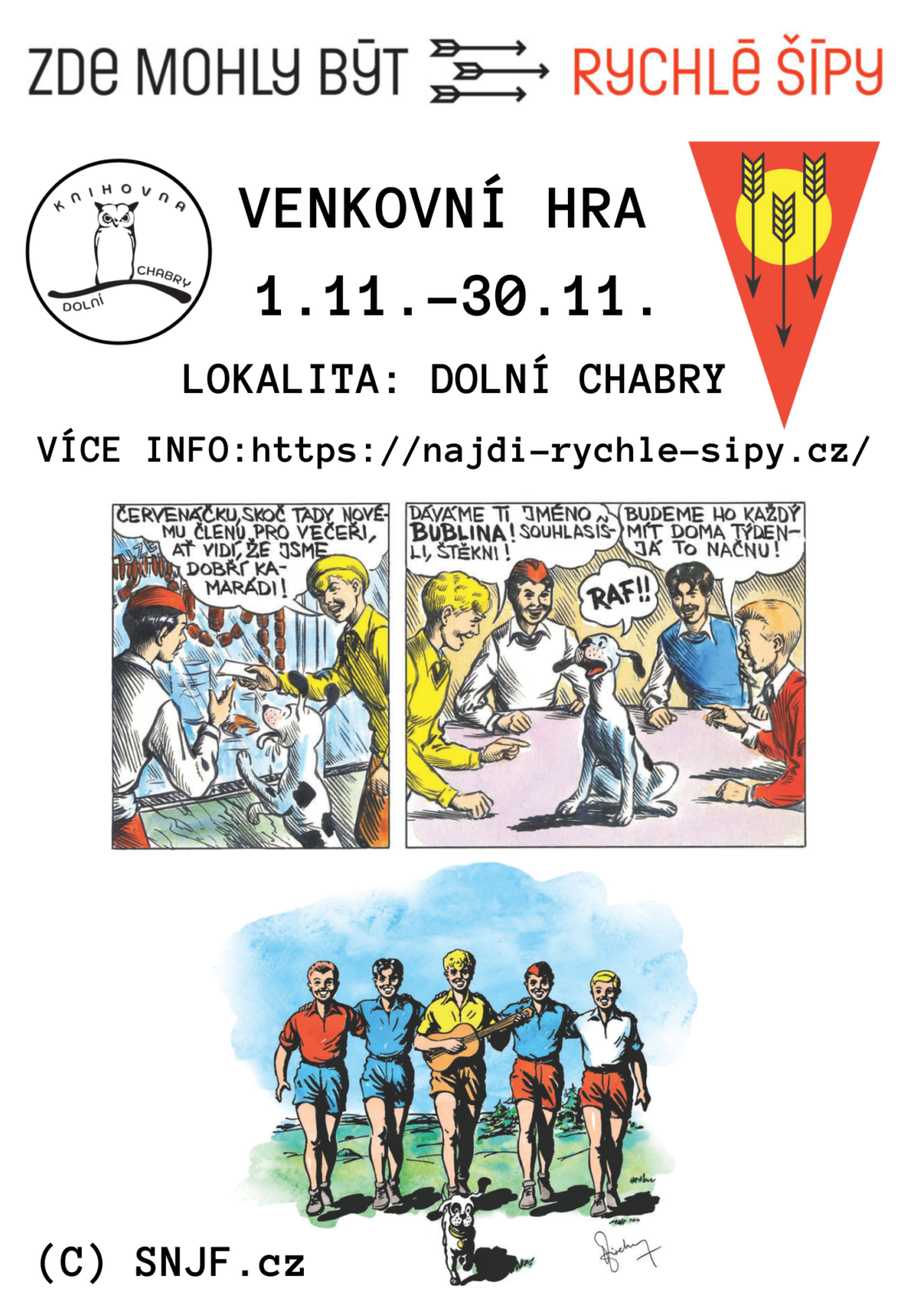 Pátrací hra po místech, kde se mohly odehrávat příběhy Rychlých šípů! Knihovna se zapojila do podzimního kola hry Skautské nadace Jaroslava Foglara Zde mohly být Rychlé šípy. Oblíbený komiks Rychlé šípy letos oslavuje 85. výročí od svého prvního vydání. Po celý listopad hledejte na 11 provozovnách a institucích na území Dolních Chaber plakáty komiksových Rychlých šípů. Každý z nich bude vyprávět příběh, který se kdysi mohl „odehrát“ na podobném místě, a bude obsahovat pořadové číslo a písmeno. Po nalezení plakátu si hráč číslo a písmeno opíše a na webu https://najdi-rychle-sipy.cz/ pak všechny části tajenky doplní. Tím se zapojí do slosování o ceny s rychološípáckou tematikou, které do soutěže věnovala Skautská nadace Jaroslava Foglara. Každému hráči, který odešle správně vyluštěnou tajenku, bude na e-mailovou adresu zaslán Pamětní list Rychlých šípů s poděkováním za účast ve hře. Těšíme se na všechny účastníky!