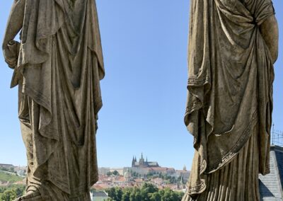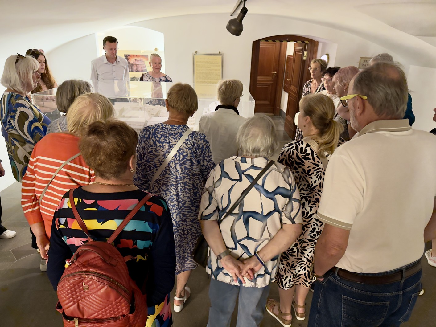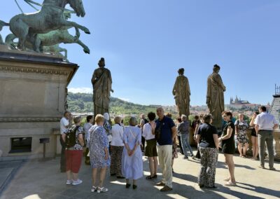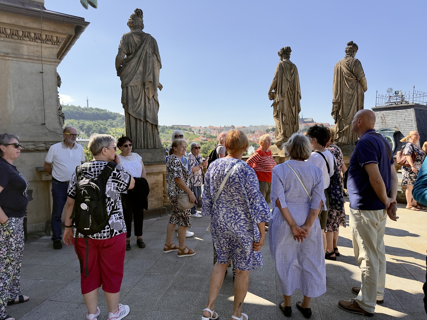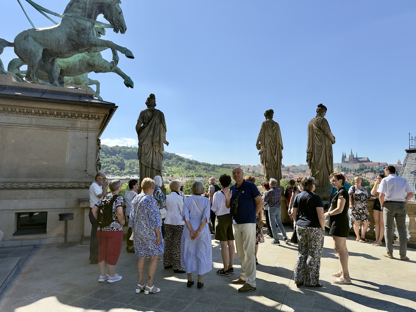 Na komentovanou prohlídku Zlaté kapličky jsme se vydali společně s dvaceti zájemci koncem června. Výklad erudované průvodkyně v těchto mimořádných prostorách jsme vyslechli se zatajeným dechem. Pozornost všech upoutaly prostory, do kterých se návštěvník běžně nepodívá, např. k základním kamenům nebo na nejvyšší veřejně přístupný bod ND terasu se sousoším Trig s výhledem na Pražský hrad. Spokojenosti účastníků komentovaných vycházek si velmi vážíme a s potěšením je zařadíme i do podzimního programu Kulturního centra.