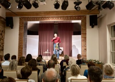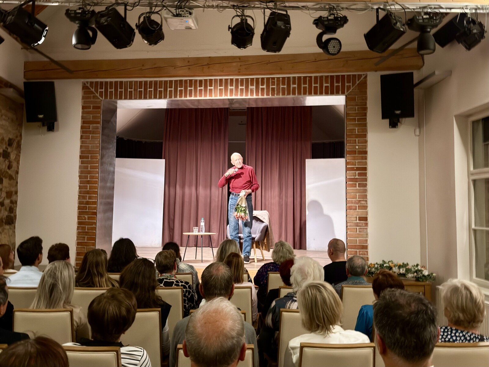 „Setkání s Petrem Nárožným“ je pořad, který jsme zhlédli ve čtvrtek 16. října ve vyprodaném Velkém sále Chaberského dvora. V úctyhodném věku 87 let dokázala tato herecká legenda bavit publikum svými vzpomínkami na konferenciérskou i hereckou kariéru téměř dvě hodiny. Po skončení pořadu bylo možné si nechat podepsat donesené fotografie, knihy nebo CD. Vašeho zájmu si vážíme a děkujeme.