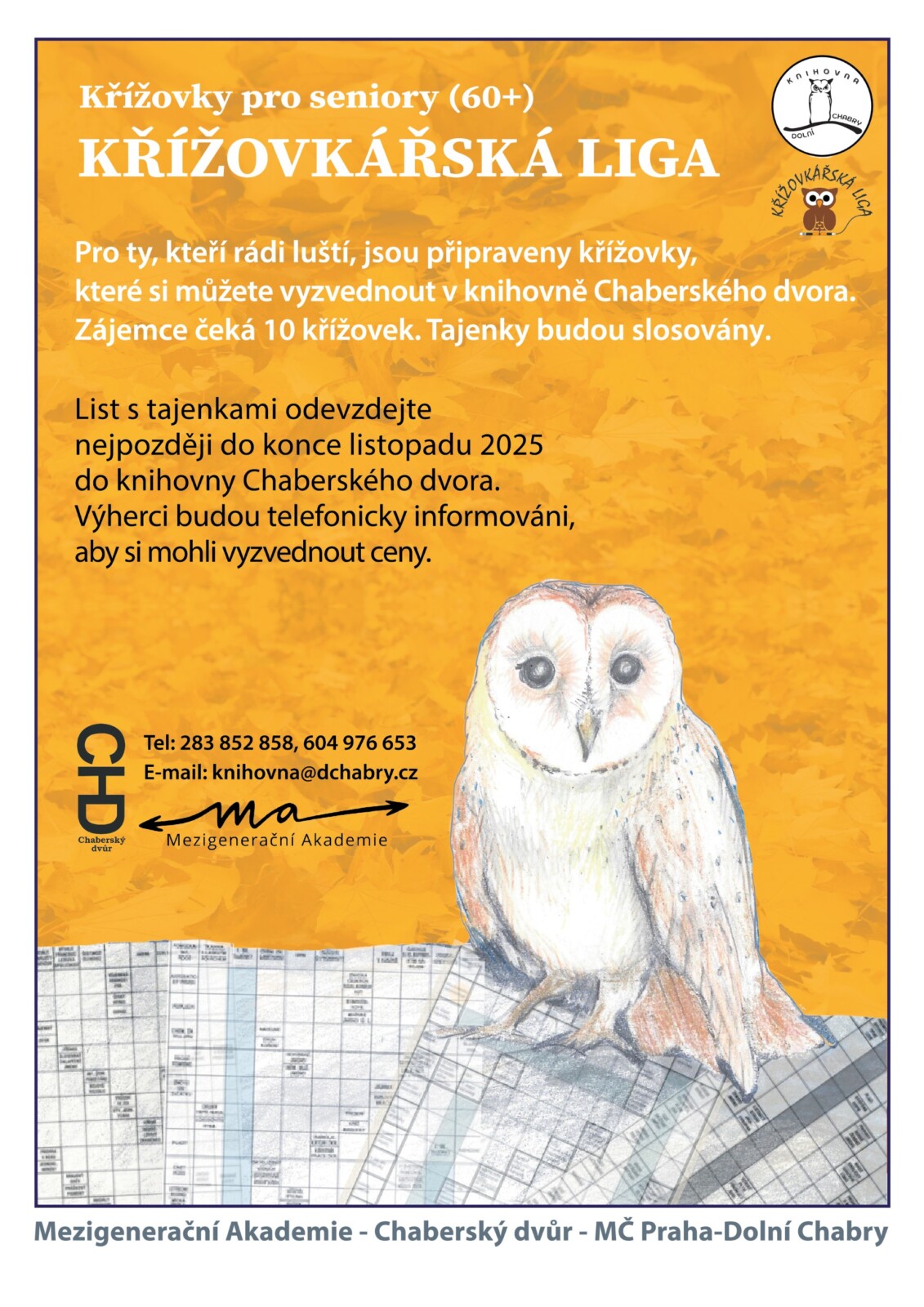 Oblíbená křížovkářská liga je zpět. Podzimní kolo potrvá po celý listopad a již nyní jsou v KC/knihovně k vyzvednutí sady křížovek na podzimní sychravé večery… Po skončení vylosujeme výherce věcných cen. Soutěž spolupořádá Mezigenerační Akademie, Kulturní centrum Chaberský dvůr a MČ Praha-Dolní Chabry.