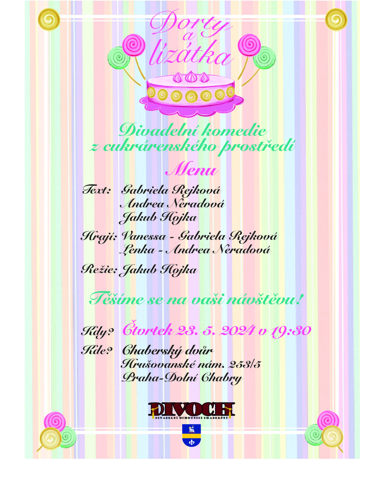 DIVOCH – divadelní ochotníci chaberští vás zvou na reprízu hry Dorty a lízátka, jejíž představení se bude konat ve čtvrtek 23. května 2024 od 19:30 hodin v Chaberském dvoře.