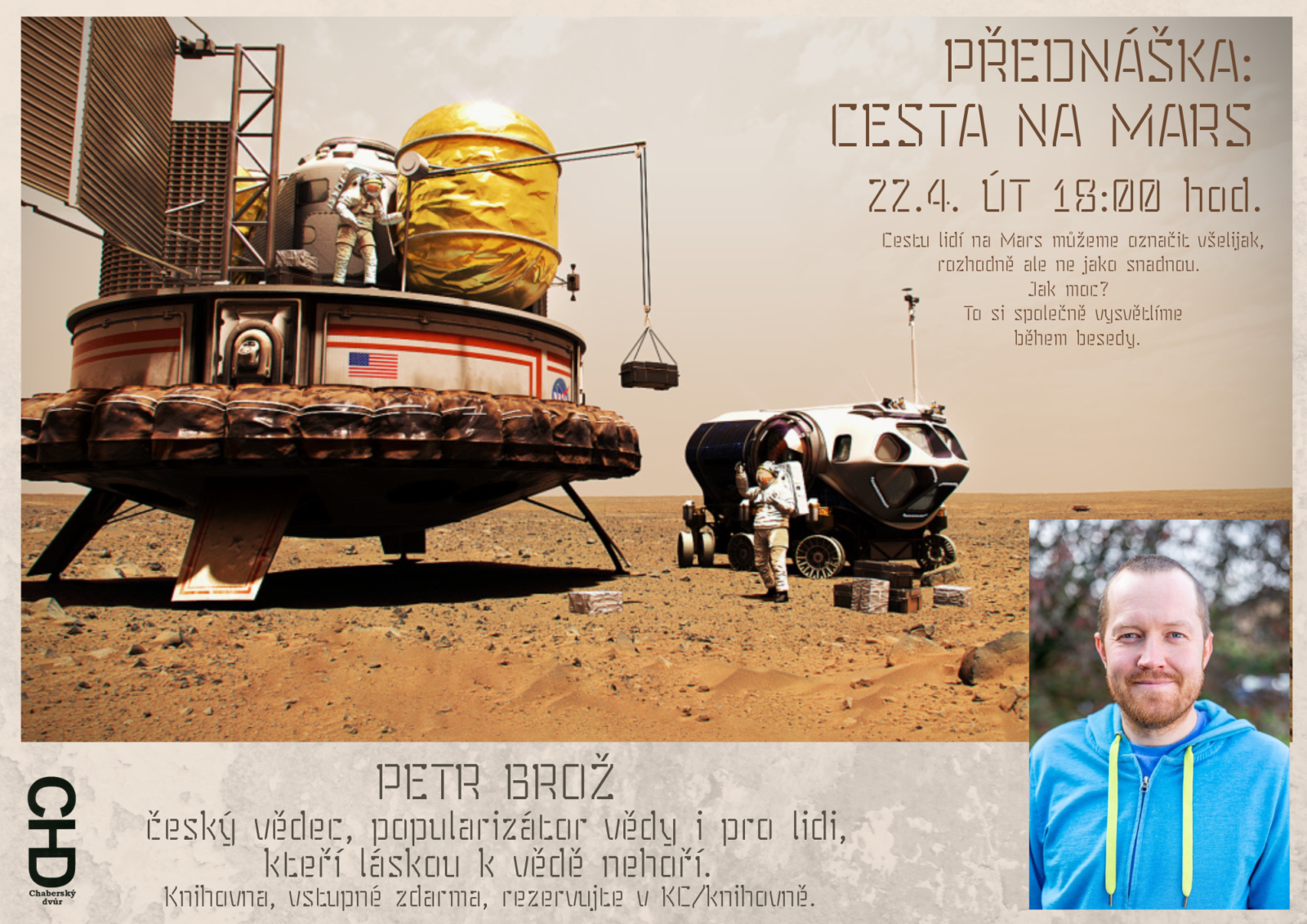 Stříbrné plátno i stránky knih nás zásobují představou, že cesta na Mars bude brnkačka. V jednu chvíli sedíte v křesle rakety na oběžné dráze Země a za pár minut nebo několik desítek stránek hledíte na povrch Marsu. A to v tom lepším případě. V tom horším se totiž jen ozve „zapněte motory“, střih a najednou sledujete scénu, kdy hlavní hrdinka či hrdina bojuje o přežití v nehostinném prostředí Marsu či neúprosně kosí v podzemních základnách nekonečná hejna emzáků. Bohužel vás ale zklamu. Realita je jinde. Cestu lidí na Mars můžeme označit všelijak, rozhodně ale ne jako snadnou. Jak moc? To si společně vysvětlíme během besedy.