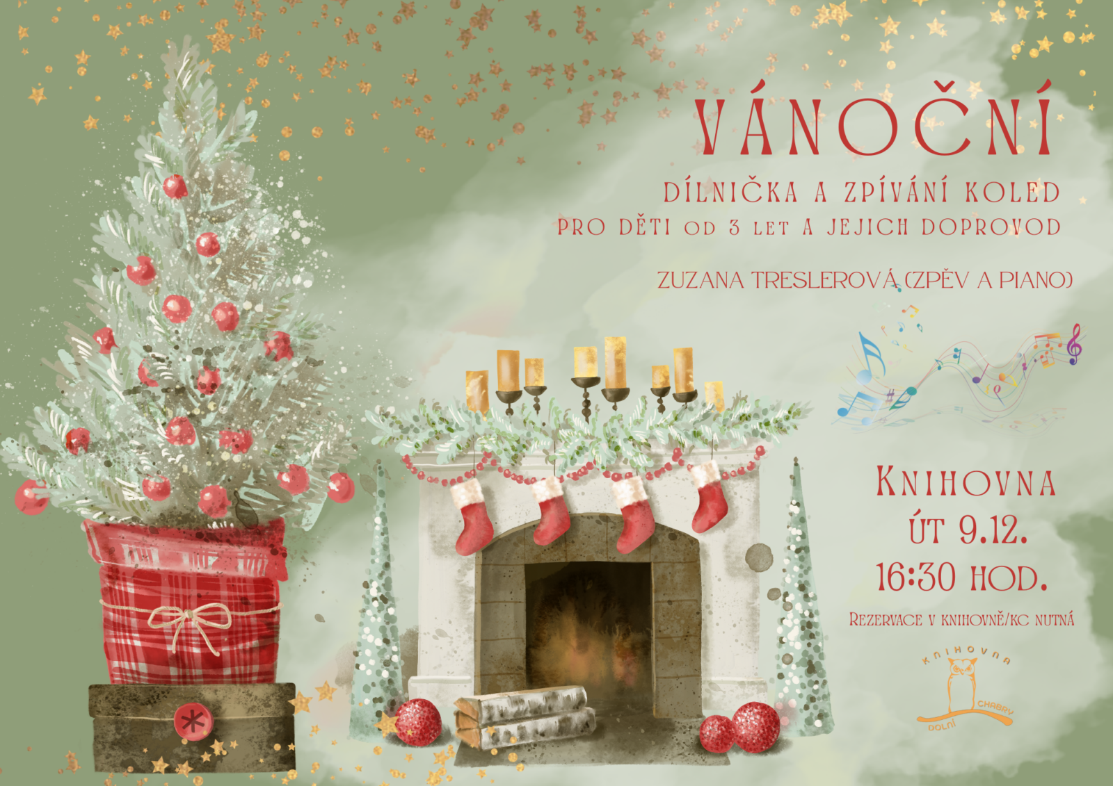 Adventní čas je v plném proudu. Přijďte si jej užít do knihovny a zazpívat si koledy za hudebního doprovodu Zuzany Treslerové. Budeme také společně tvořit, děti si vyrobí vánočního andílka a vlastní zpěvníček. Určeno pro děti od 3 let a jejich doprovod. Rezervace v KC/knihovně, vstup zdarma.