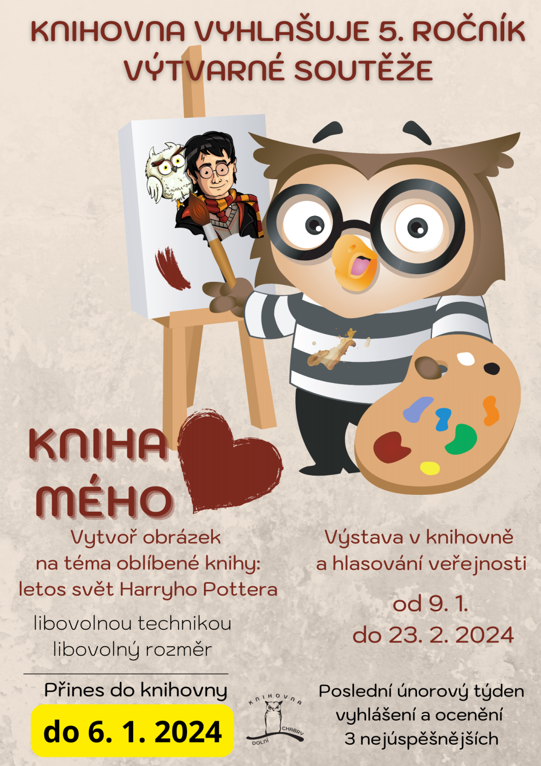 Všechny malé výtvarníky zveme k účasti v dalším ročníku výtvarné soutěže Kniha mého srdce. Ořezejte pastelky, vytáhněte štětce, barvy, jdeme na to. Letos preferujeme obrázek na téma magického světa Harryho Pottera, ale neodmítneme ani žádné jiné. Těšíme se na vaše sovy, kouzelníky, fantastická zvířata nebo postavy z této nejoblíbenější dětské knižní série. Jakýkoliv formát, jakákoliv výtvarná technika, fantazii se meze nekladou. Noste do knihovny do začátku ledna a poté až do února vystavujeme a hlasujeme o ten nejhezčí!