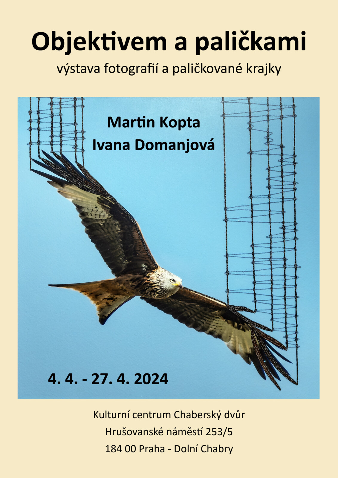 Ivana Domanjová a Martin Kopta jsou sourozenci. Při své první společné výstavě návštěvníkům představí práce z posledních let Ivana připravila obrazy, fascinátory a oděvní doplňky z paličkované krajky, její bratr Martin se představí řadou rozměrných fotografií ze světa zvířat. Doufáme, že vás vzájemné propojení dvou zdánlivě nesourodých témat potěší.