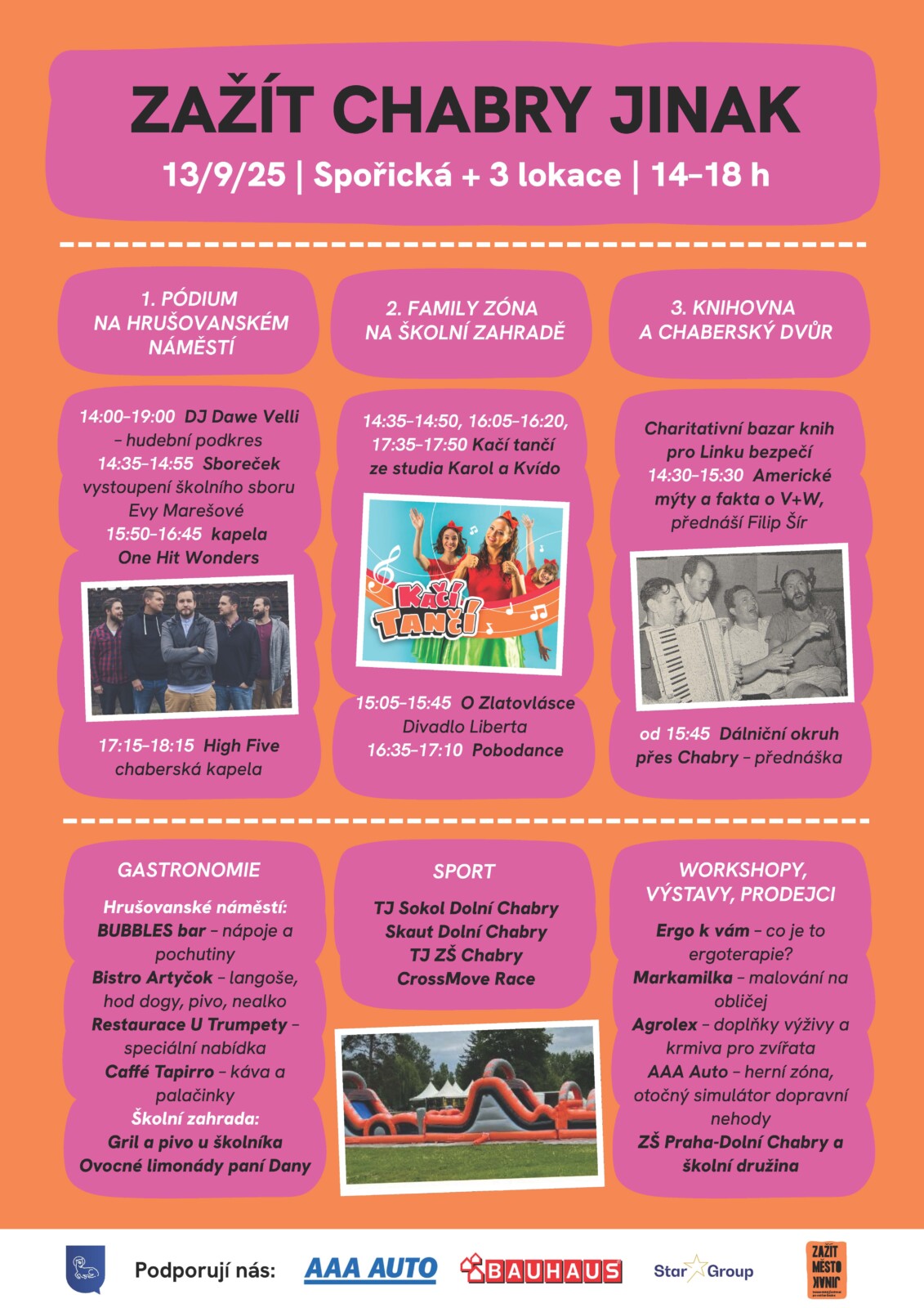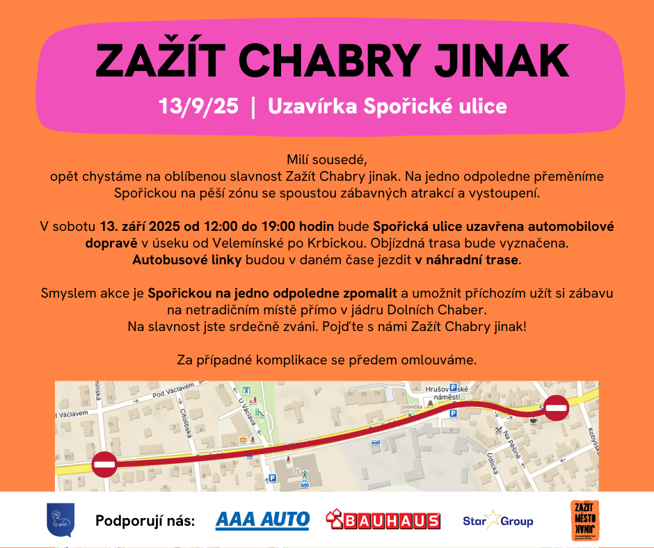 Za necelé dva týdny vypukne opět velká sousedská slavnost Zažít Chabry jinak! A letos to trochu osvěžíme. V sobotu 13. září ožije na jedno odpoledne mixem zábavy, tance, hudby a podívané nejen celá Spořická, ale těšit se můžete rovnou na tři připojené lokace nabité pestrým a zajímavým programem.
