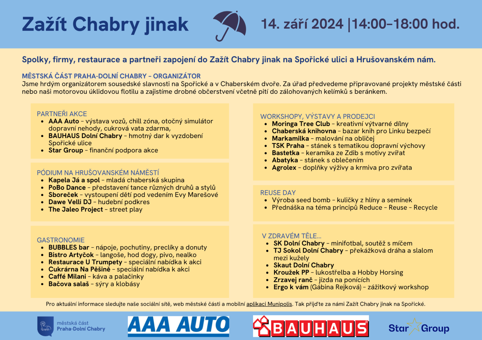 Celá Spořická ožije během sobotního odpoledne 14. září 2024 od 14:00 do 18:00 hodin řadou vystoupení, workshopů, soutěží a spoustou dalšího včetně bohaté nabídky občerstvení. Zapojí se celé Chabry včetně partnerů AAA Auto, BAUHAUS Dolní Chabry a Star Group.