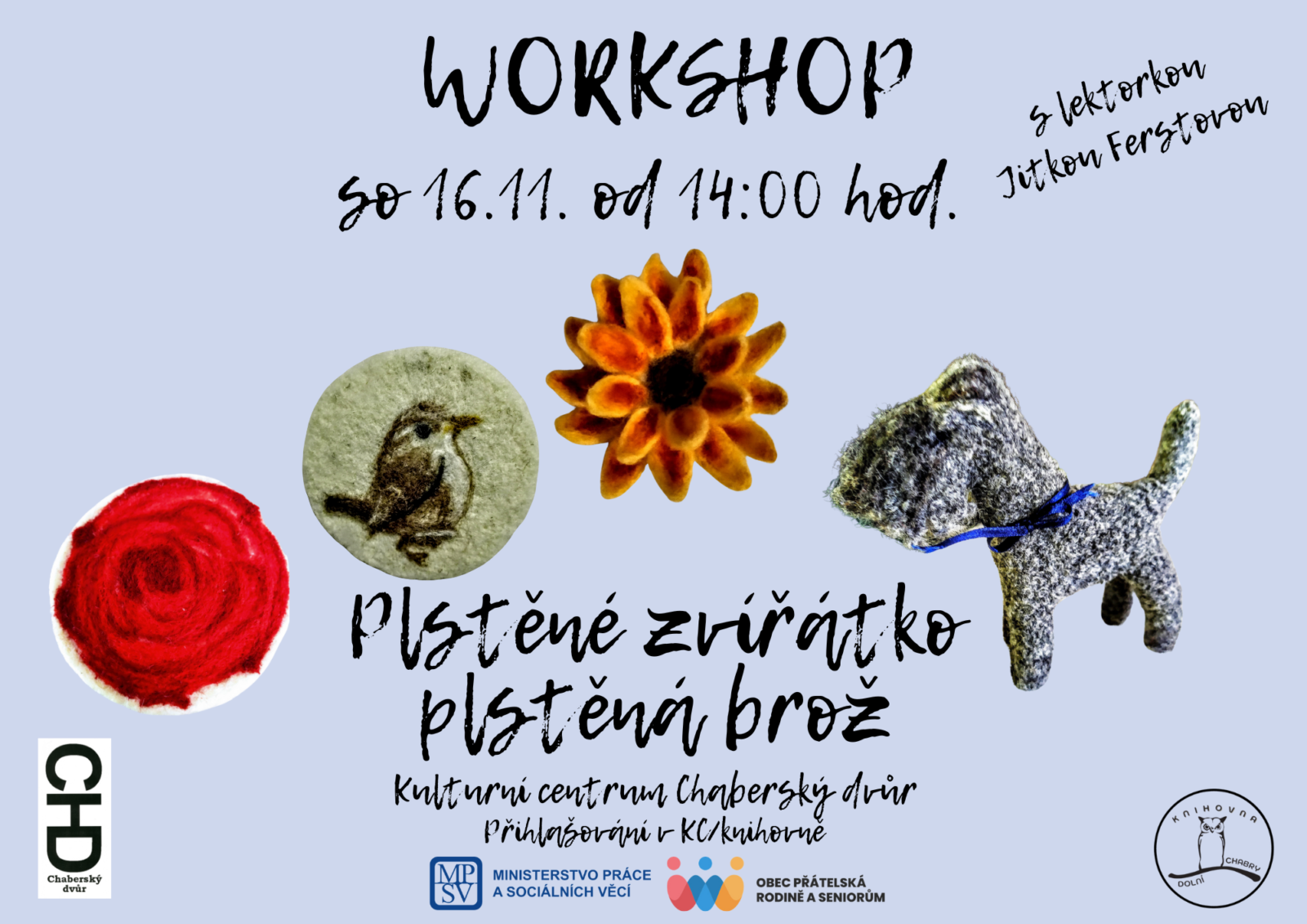 Workshop: Plstěné zvířátko, brož Zveme vás na workshop Plstěné zvířátko, brož. S lektorkou Jitkou Ferstovou v sobotu 16. listopadu 2024 od 14:00 hodin. V Kulturním centru Chaberský dvůr, vstup zdarma. 16. 11. so 14:00