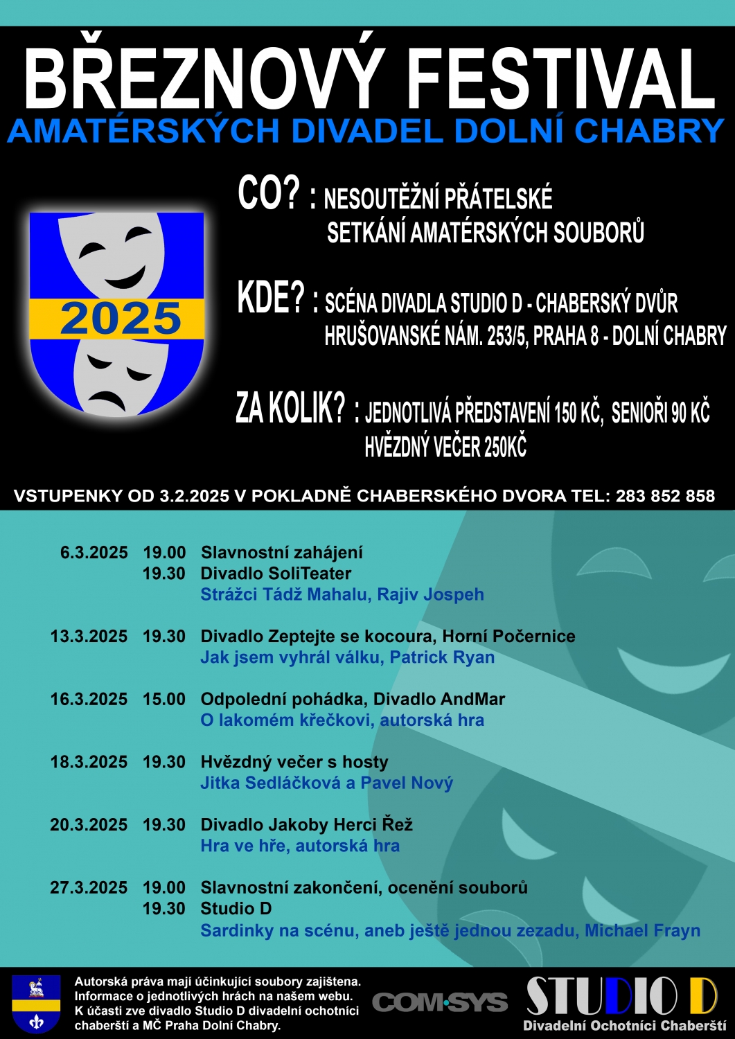 Březnový festival: Slavnostní zakončení, ocenění souborů a Studio D Studio D vás zve na Březnový festival amatérských divadel Dolní Chabry. Ve čtvrtek 27. března 2025 – Slavnostní zakončení, ocenění […]
