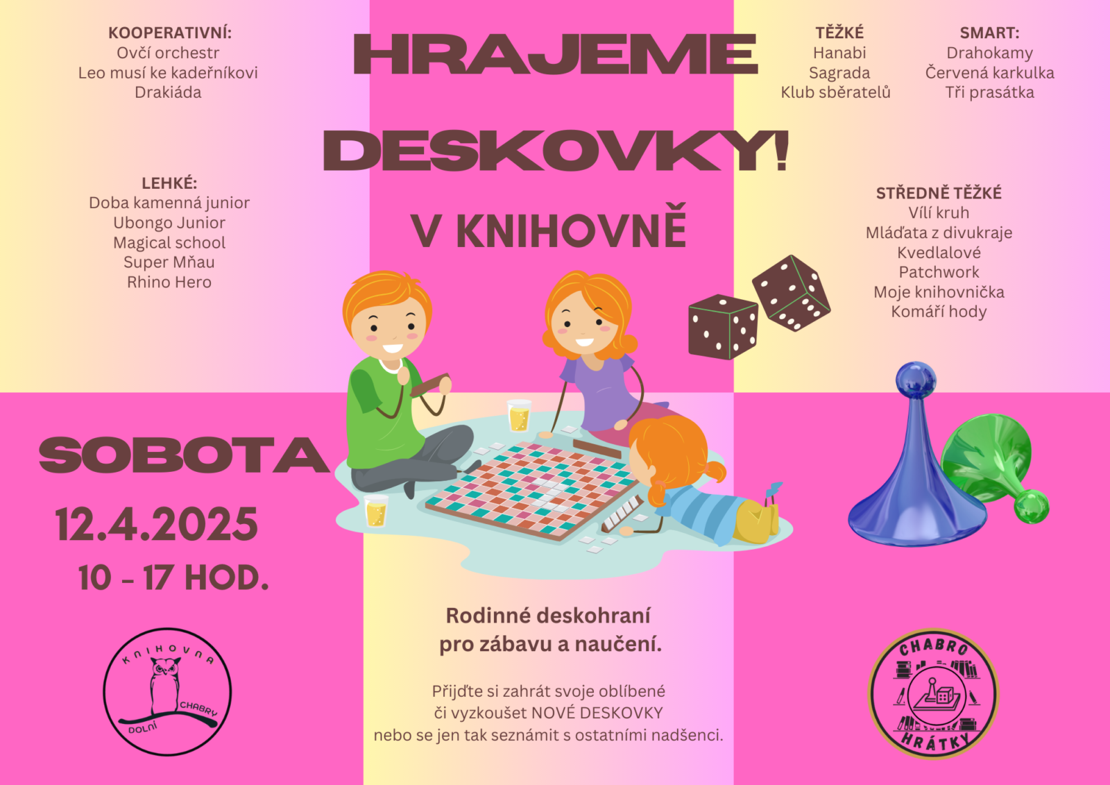 Hrajeme deskovky Díky Lence Valderové a Martě Litvaj se nepravidelné deskoherní páteční odpoledne nebo celodenní hraní v sobotu stávají stále oblíbenější a hojně navštěvované. V dubnu se sejdeme v knihovně hned dvakrát. Nejdříve si můžete […]